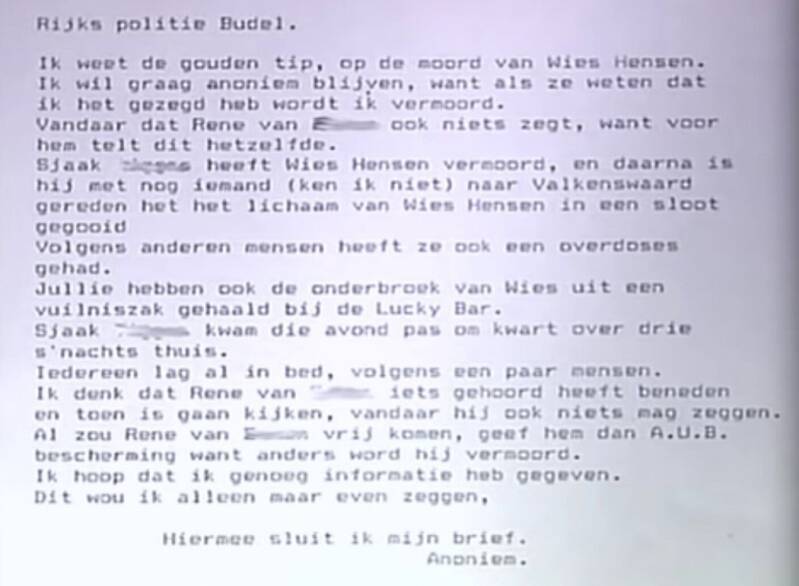 Een onthutsende link tussen beide moordzaken is dat de politie in november 1989 per post onderstaande anonieme tip ontving.